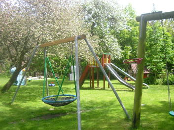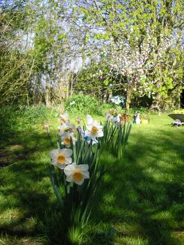 In unserem parkähnlichen Garten blühen Apfel-, Kirsch-, und Mandelblaum. Verschiedene Blumen sprießen.